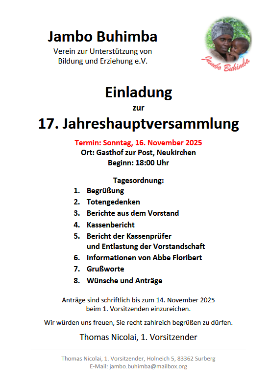 "Jambo Buhimba e.V." ist aber auch ein gemeinnütziger Verein, der es sich zur Aufgabe gemacht hat, Bildung und Erziehung in diesem sehr armen Gebiet zu unterstützen. Der Weg aus der Armut wird langfristig nur durch eine fundierte Schulausbildung der Kinder und Jugendlichen gelingen. Nur dann besteht die Möglichkeit, über die notwendige Berufsausbildung auch die soziale Struktur zu verbessern.